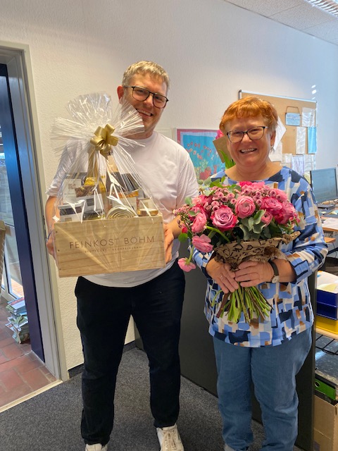 Als Förderverein wollten wir natürlich nicht „einfach so“ Tschüss sagen. Deshalb gab es zur Verabschiedung einen gut gefüllten Präsentkorb und einen bunten Blumenstrauß – als kleines Dankeschön für alles, was sie über die Jahre für unsere Schulgemeinschaft getan hat.